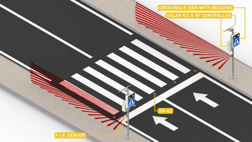 Passages piétons intelligents détectant l’approche des véhicules électriques (scooters et voiturettes de golf) et alertant les usagers, de jour comme de nuit.
